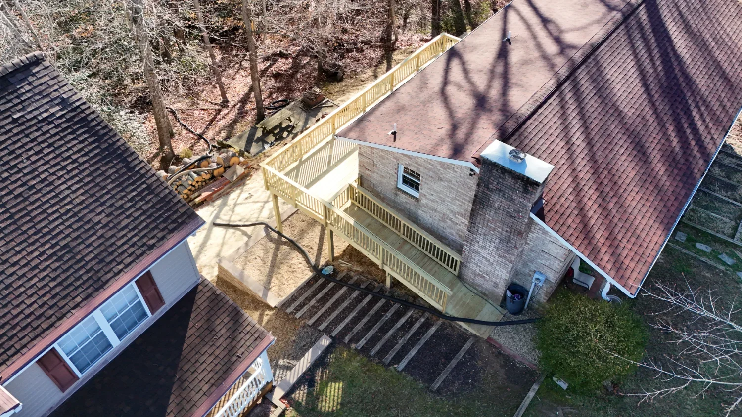 This project involved building a new elevated deck to provide the homeowners with safe and convenient outdoor access from their main living space while taking advantage of the surrounding wooded views. Because the property sits on a steep slope, the structure required careful planning, secure structural supports, and precise framing to ensure long-term stability.